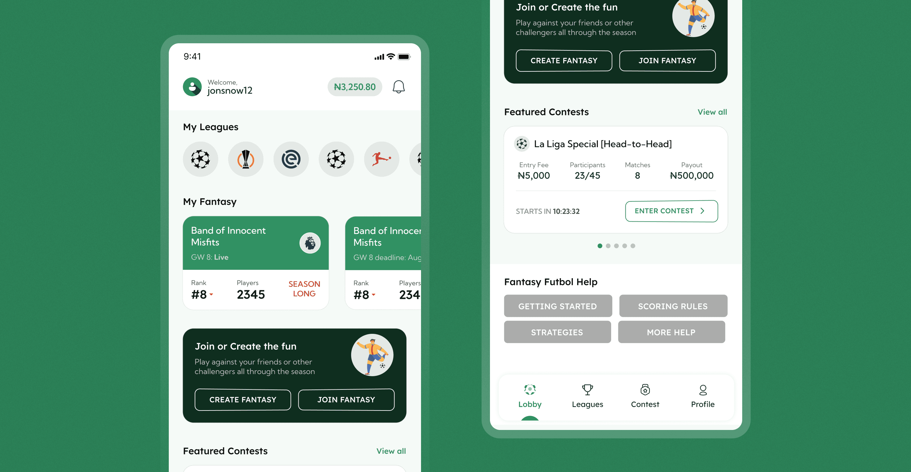 I began designing Fantasy Futbol, a mobile fantasy app featuring daily and season-long contests where users compete for real cash prizes.