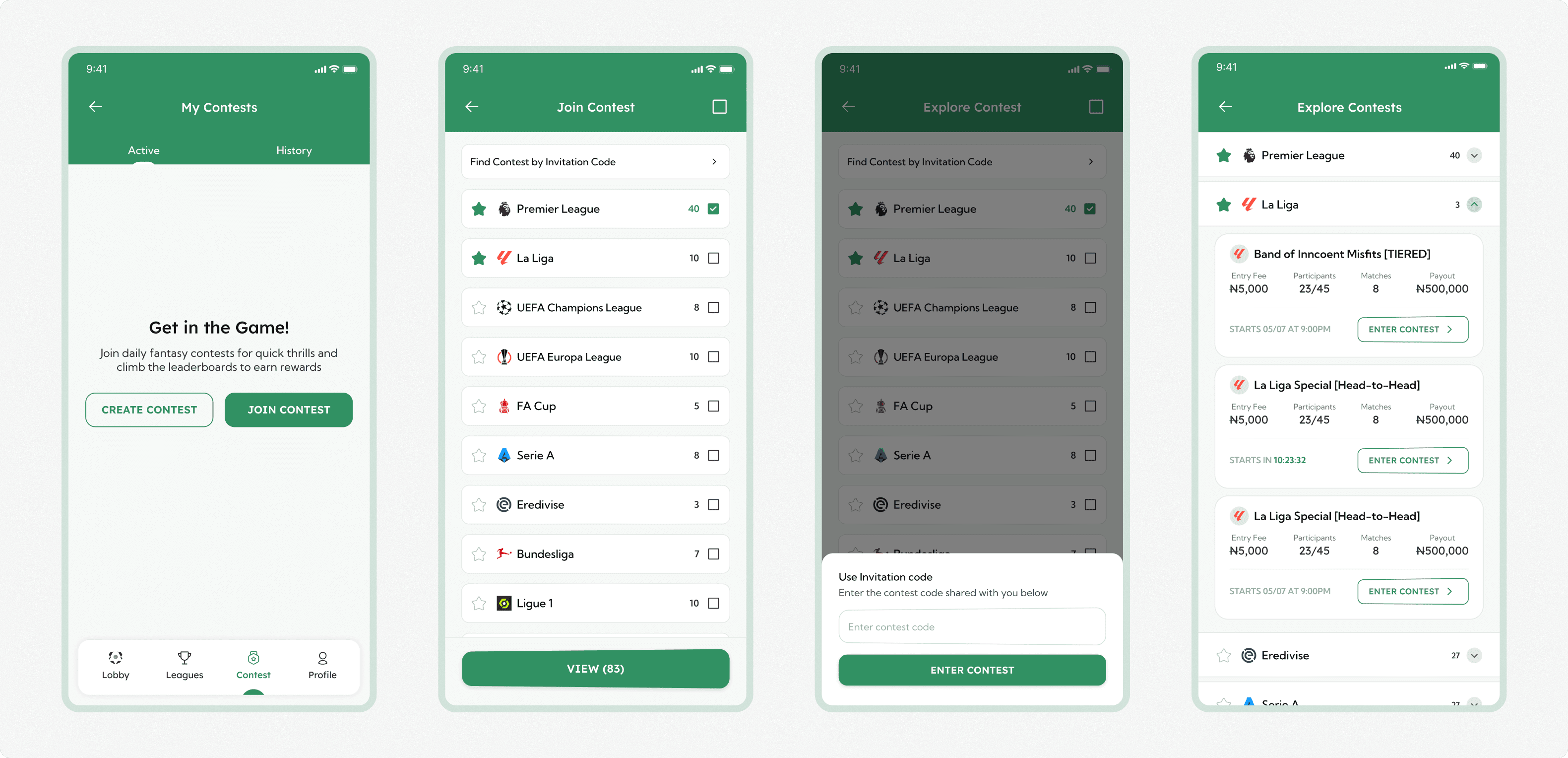 Users can join a contest either through a shared invitation code or by exploring on their own, filtering by competitions to reduce scanning fatigue.
