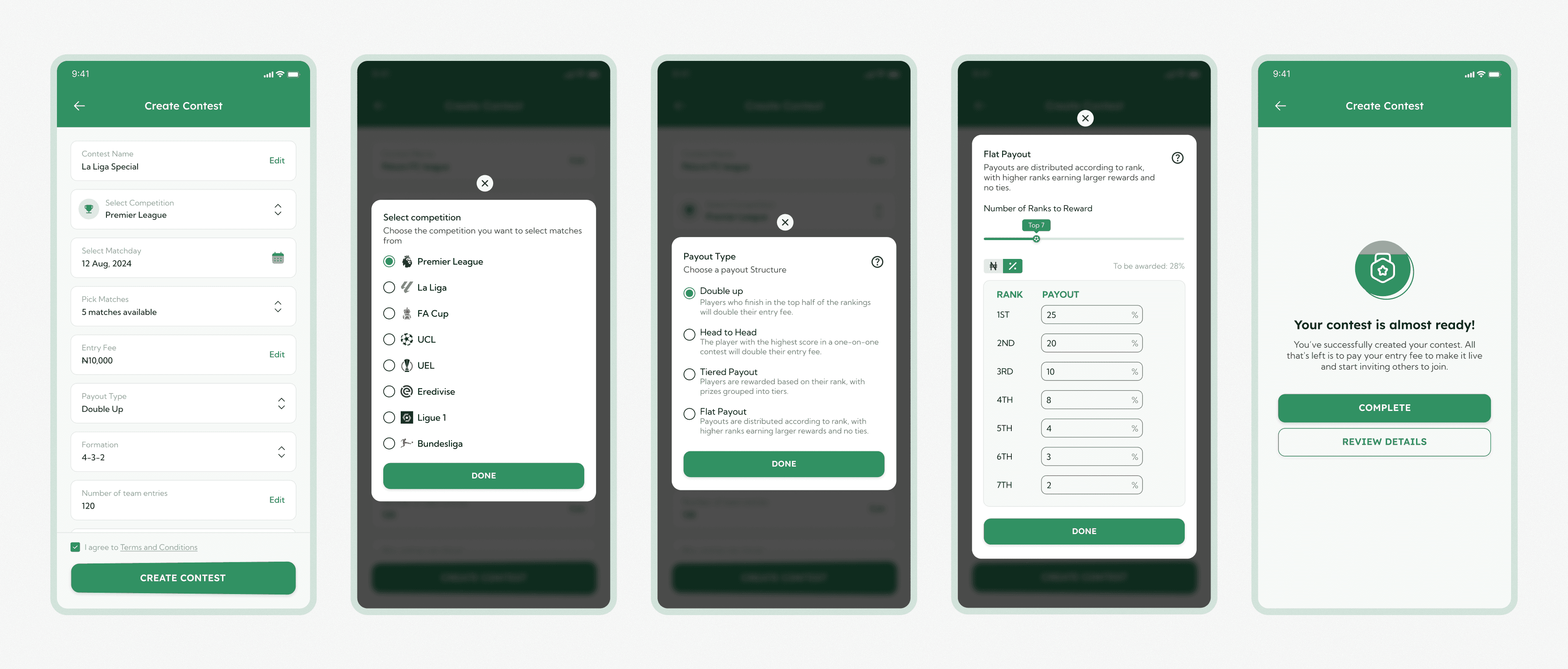 The flow followed a logical sequence: Choose the league and fixtures, define entry economics, choose payout structure, and set limits.