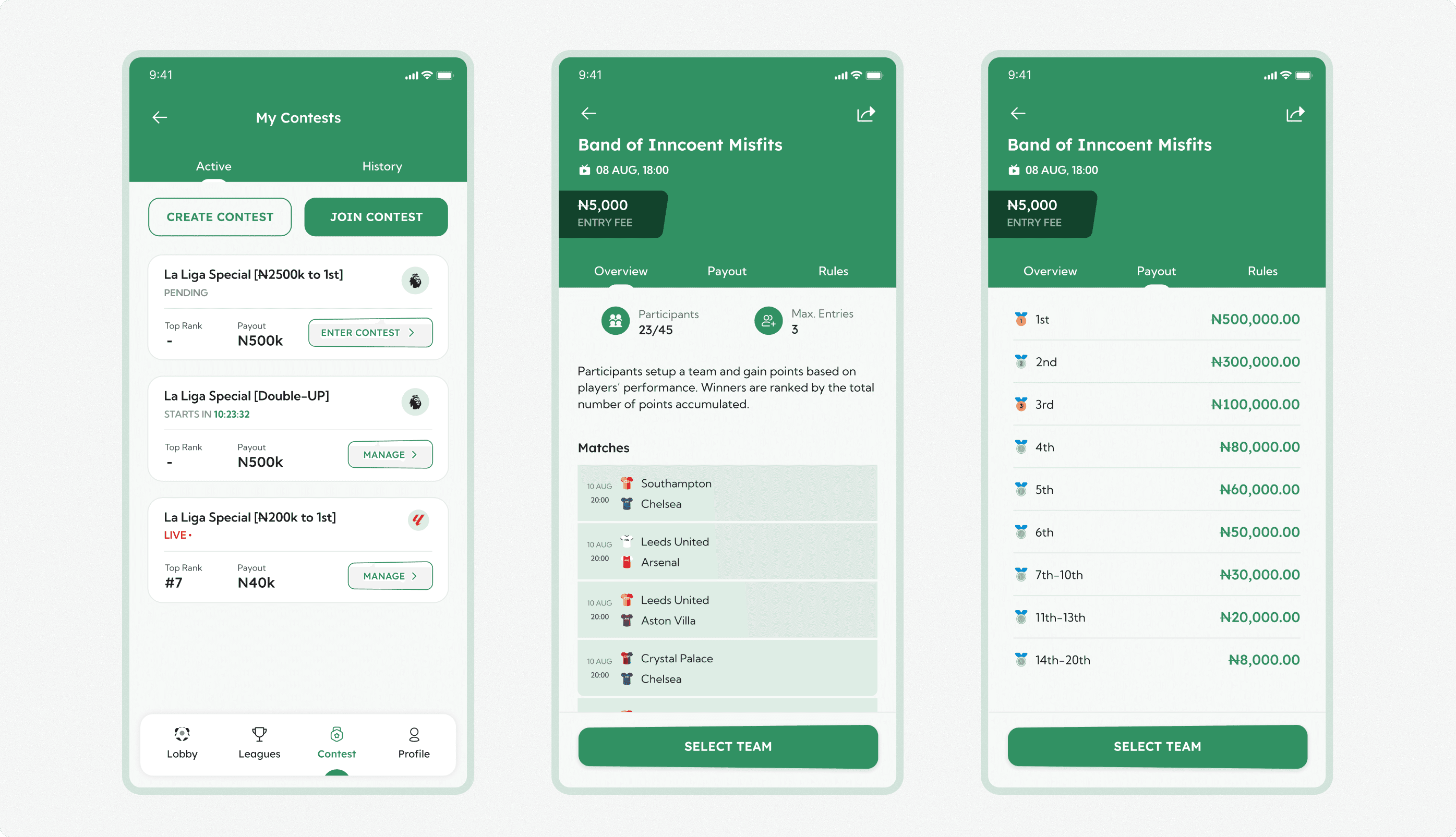 The information on the Contest Page was split into three sections(Overview, Payout, and Rules) with a major CTA to “Select a Team” and join the contest.