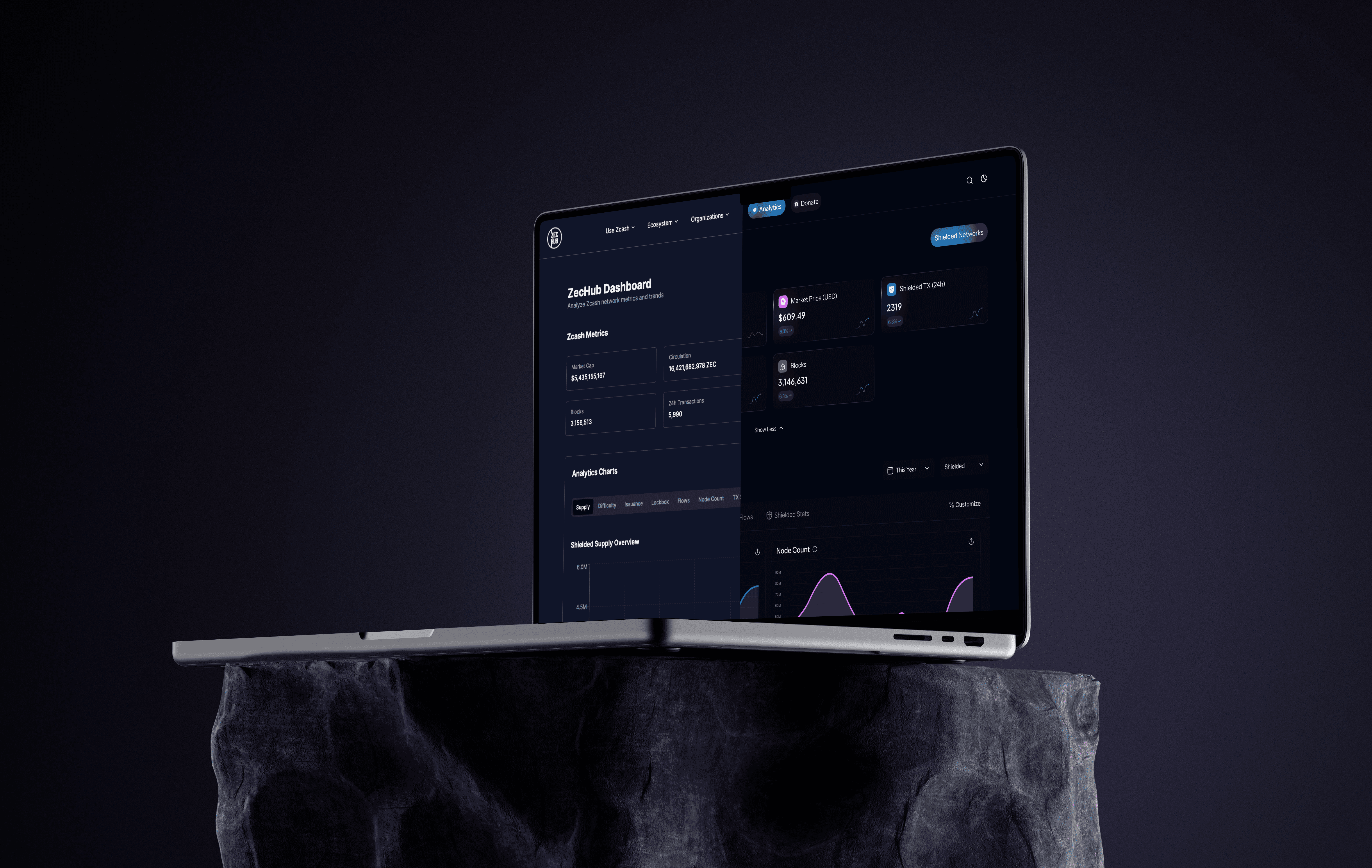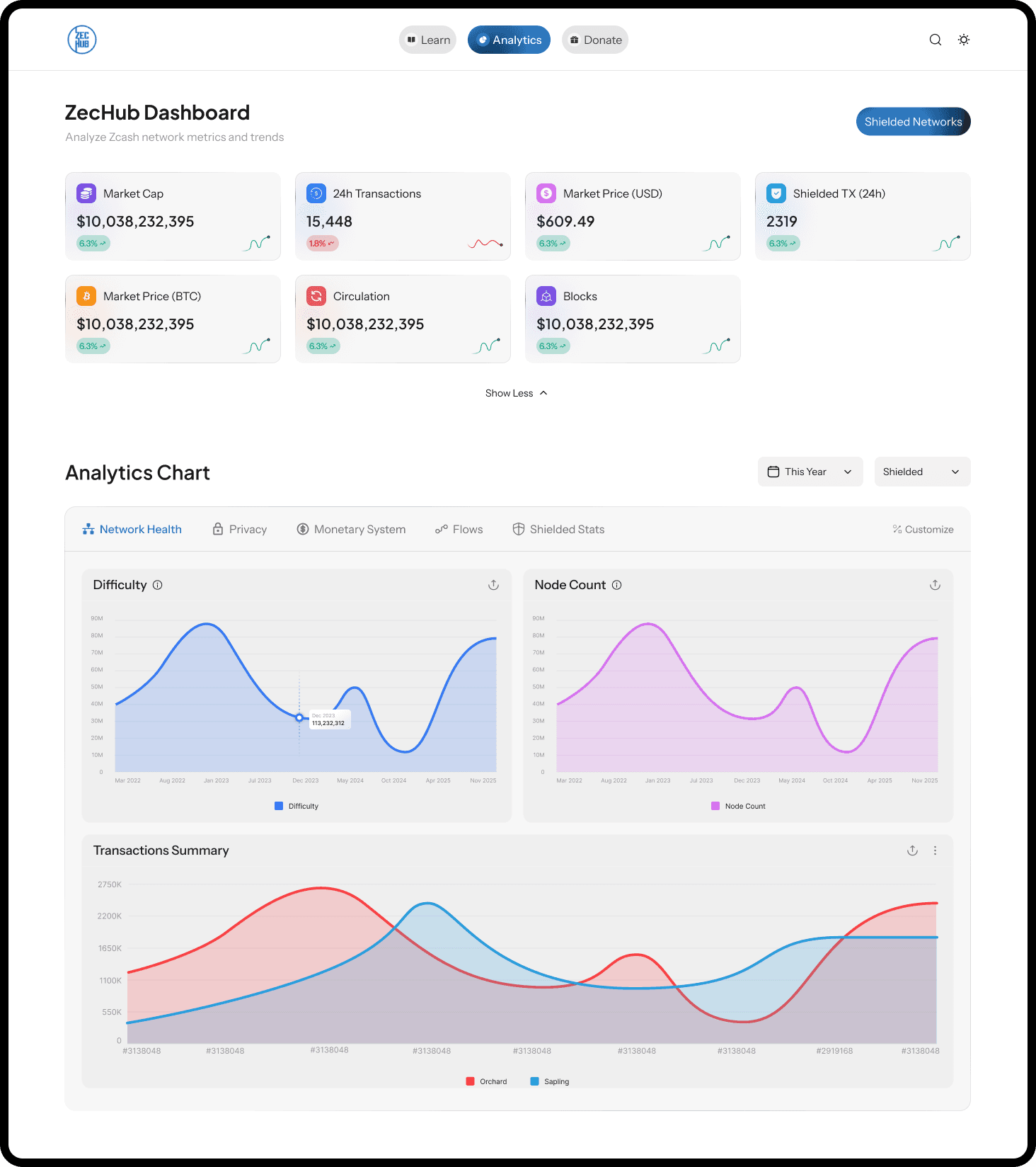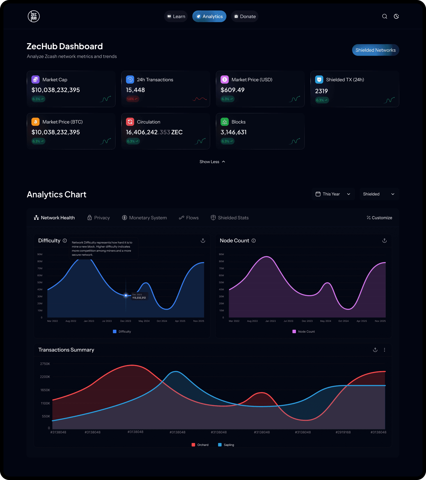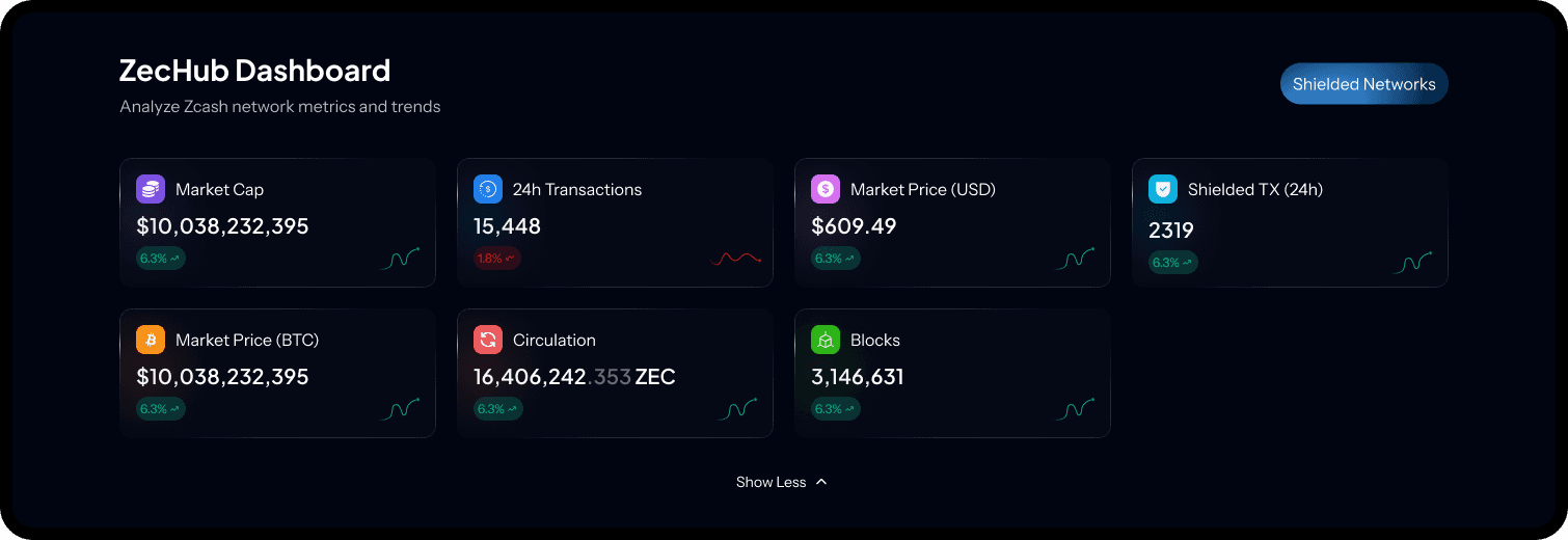The ZecHub Dashboard serves as the central information hub for the Zcash community, connecting users to network health, governance, and ecosystem activity. The existing dashboard suffered from information overload and an outdated presentation, hindering its effectiveness in supporting ZecHub's mission of building community, education, and investment tracking.